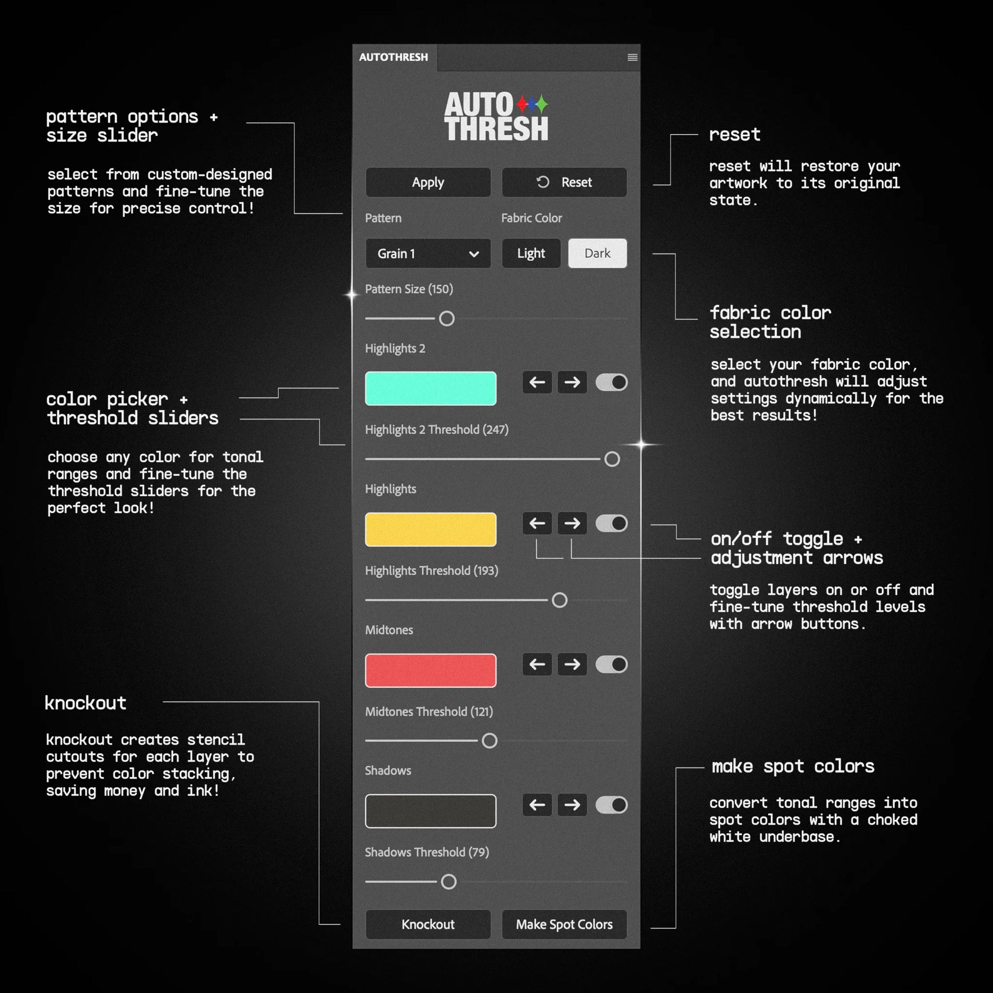 Not only can you fine-tune every detail, but AUTOTHRESH also allows you to create Spot Colors, making your artwork print-ready in just a few clicks. Perfect for adding those final professional touches, this plugin takes your designs to the next level—all while saving you hours of work.